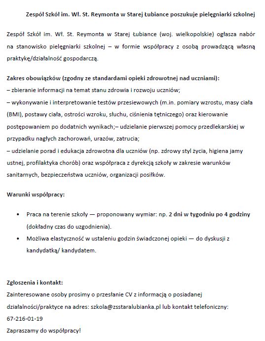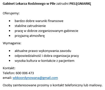 zatrudni pielęgniarkę POZ. Forma zatrudnienia, warunki płacowe do uzgodnienia. Proszę o kontakt telefoniczny lub osobisty.
